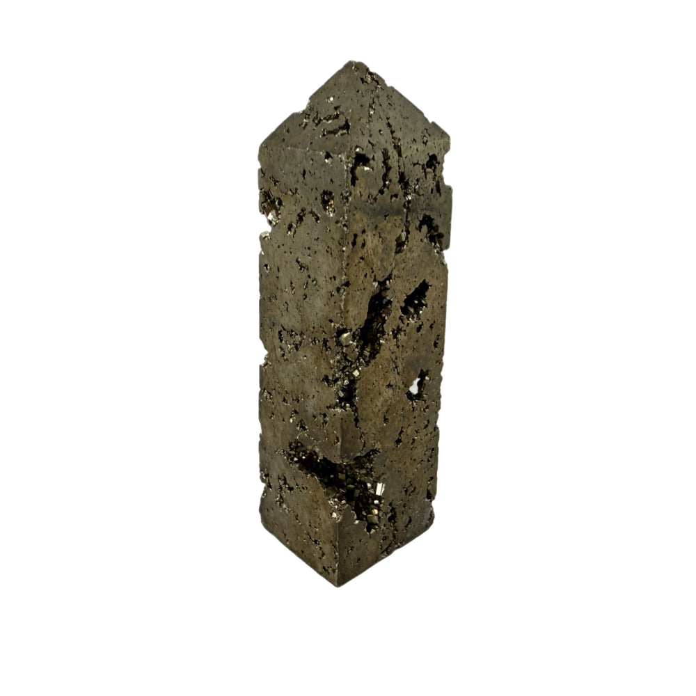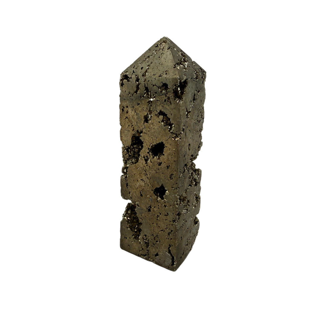 The obelisk shape gives the piece a bold, architectural presence, making it an eye-catching display specimen for a mineral collection, office, or home décor. Each piece is truly one of a kind, showcasing the natural beauty and complex crystal forms that make Peruvian pyrite famous among collectors.